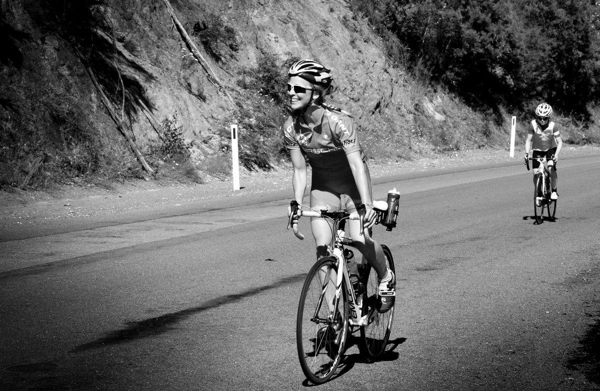 In the end there were 9 of us for that second climb — four guys and five girls! — and it was a great little bunch to ride with. We stayed together for the first few kilometres but after that things started to split apart. I found myself at the front riding with Shari Aubrey from Lead Out Cycling.