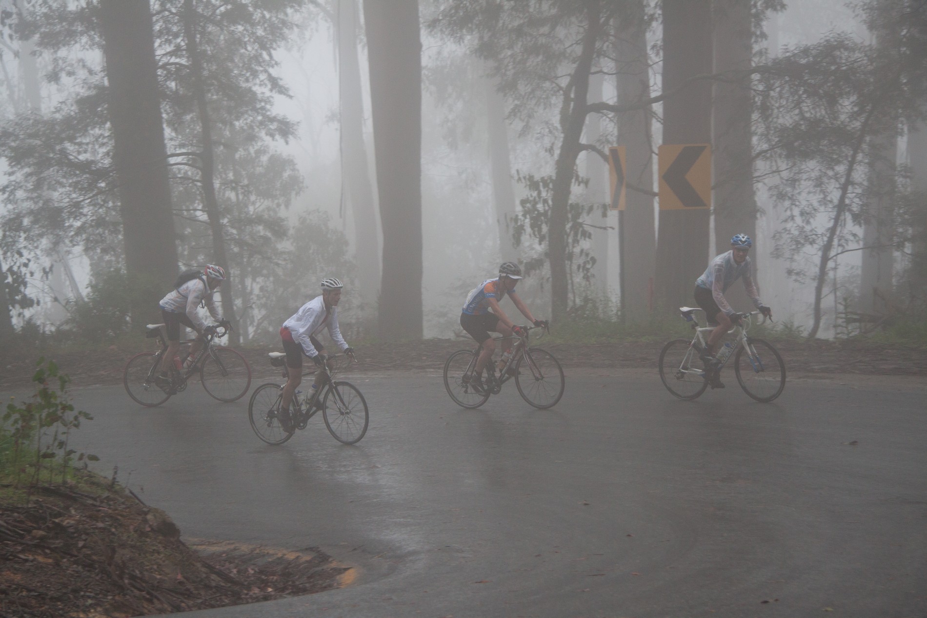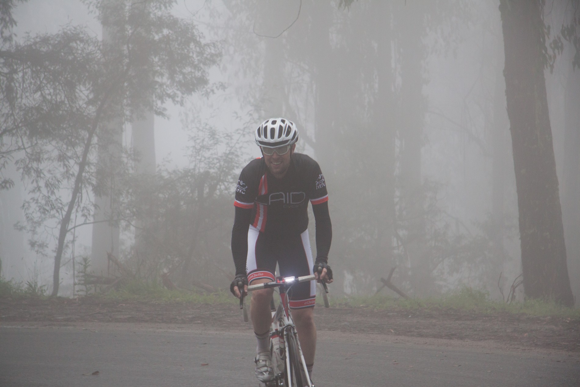 As we rode into the final few kilometres of the climb we entered the clouds and visibility dropped considerably. With the rain pouring down we made our way slowly up the steepest section of the climb — Hell Corner — and pushed through to the village. We could barely see anything in the village at all, but we found our way to the Mt. Buller Chalet and the Après restaurant where the rest of the riders were congregating.