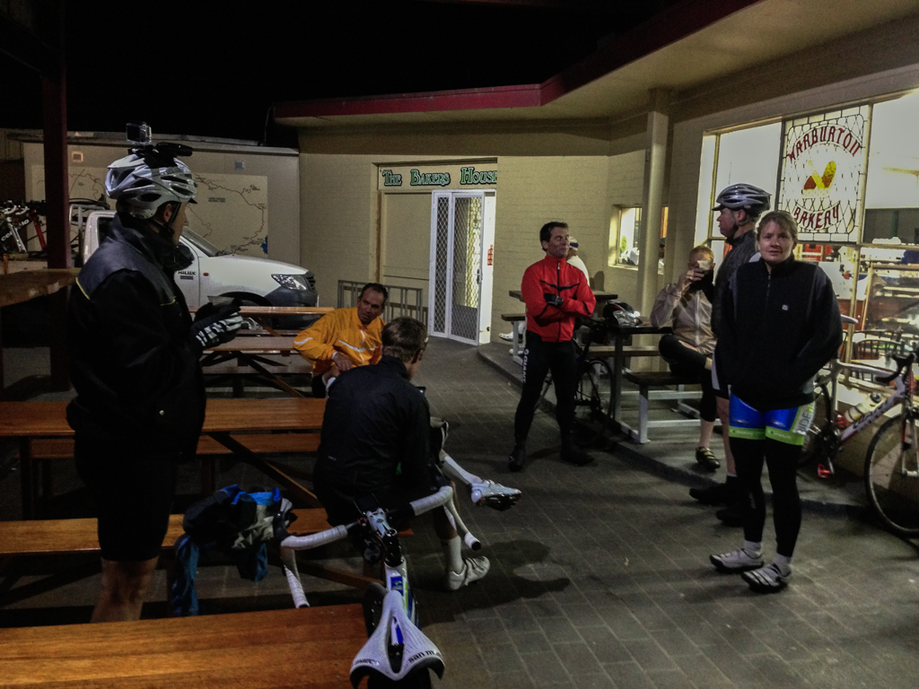 A dozen of us met at Warburton at about 9pm and set off towards the start of the climb, a sea of white and red lights flickering in the darkness. The plan had been to stay as one big group up the climb but it didn’t quite work that way. Within the first kilometre the group was spread up and down the road but we made sure no-one was left to ride on their own.