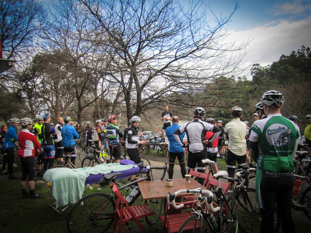 Roughly 80 riders met at the Cog Cafe in Warburton early on Sunday morning and after an opening address from Hells 500 founder and group ride architect Andy van Bergen the bunch split into two groups — those who were going to head straight up Mt. Little Joe for a “cold-legs KOM competition” and those that were going to roll straight towards the main climb of the day.