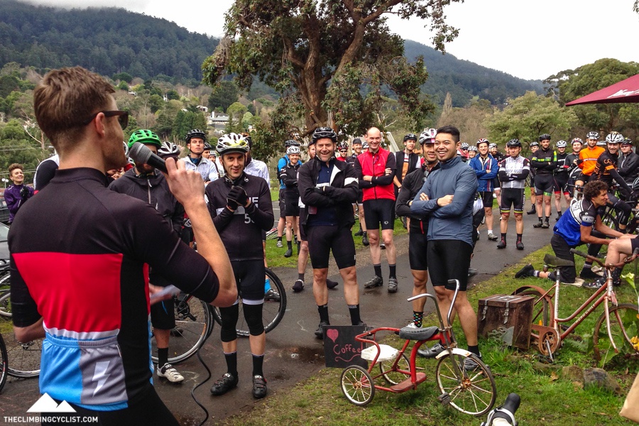 At the starting village riders queued up to get an embrocation rub down and collect their goodies (including a pair of limited edition Ol’ Dirty socks) before Andy kicked things off with a short briefing. And then we were off, heading down the Lilydale-Warburton Rail Trail towards Milgrove where we jumped on to Dee Road.